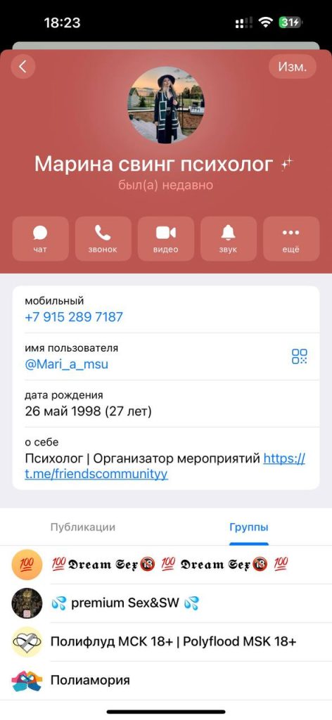 Марина является не только организатором балов, но и борделей, психологические сессии проводит на свинг вечеринках