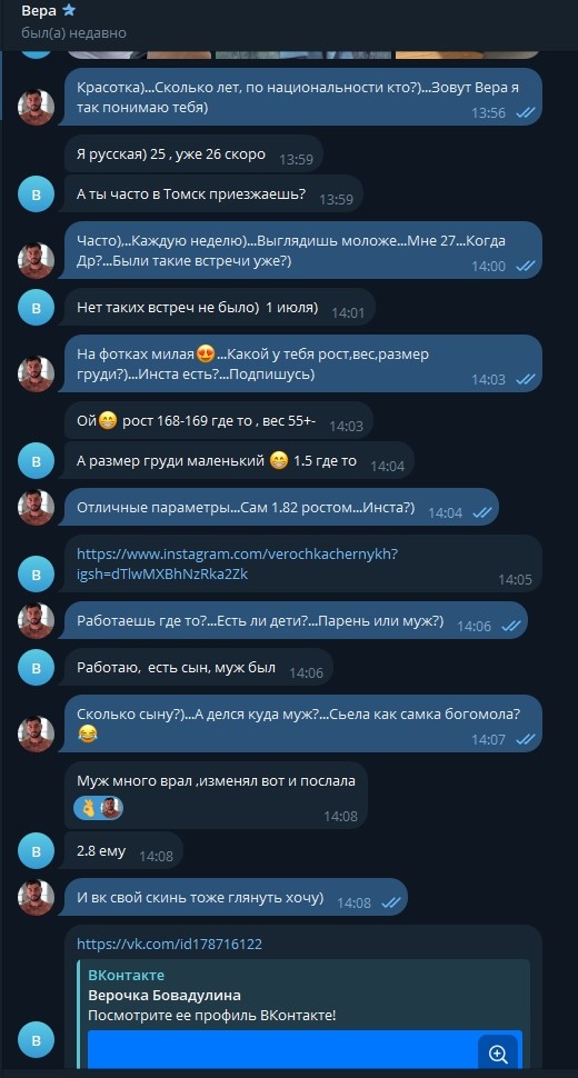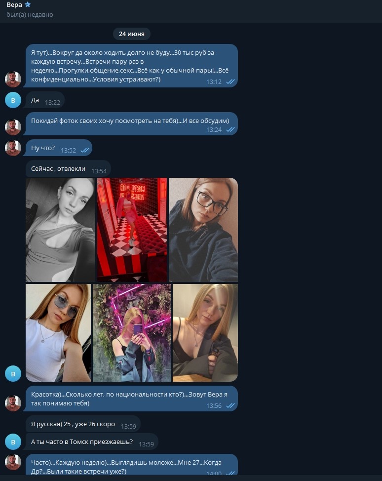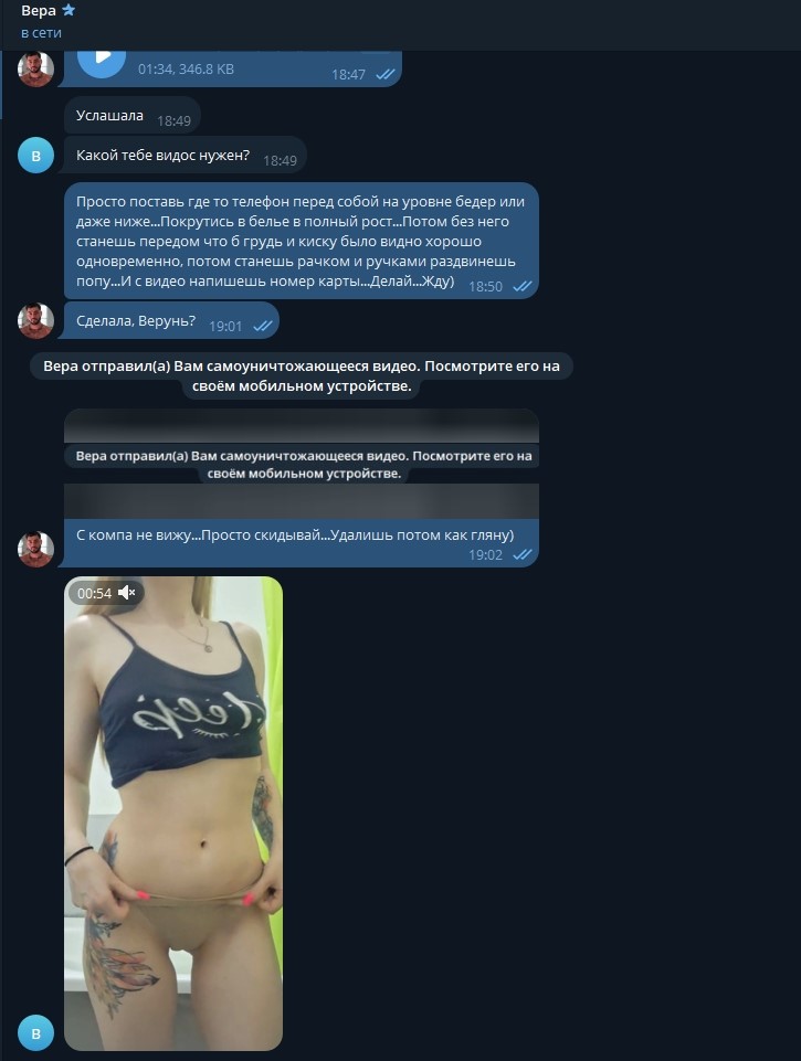 Вера из Томска сидела на сайте знакомств. Там она познакомилась с клиентами, которым отправляла откровенные материалы, не стесняясь показывать себя в самых грязных и откровенных сценах. Ради заработка Вера была готова на всё — от жёсткого секса до удовлетворения самых странных запросов, лишь бы получить свои деньги.