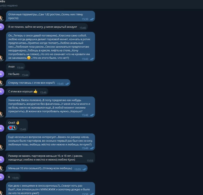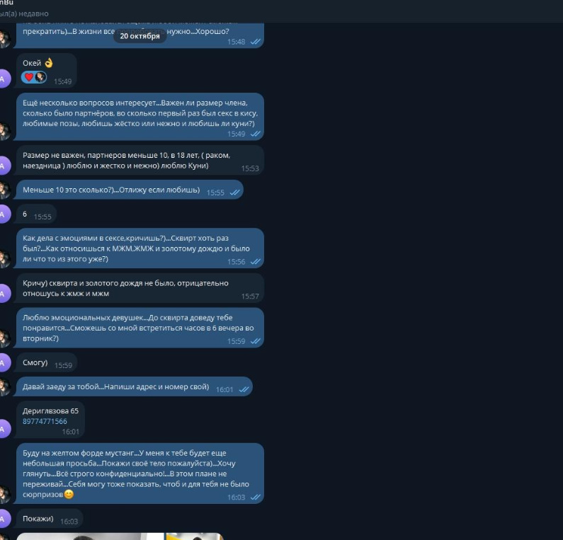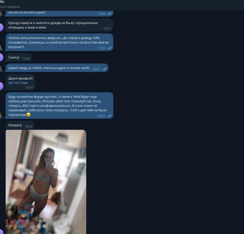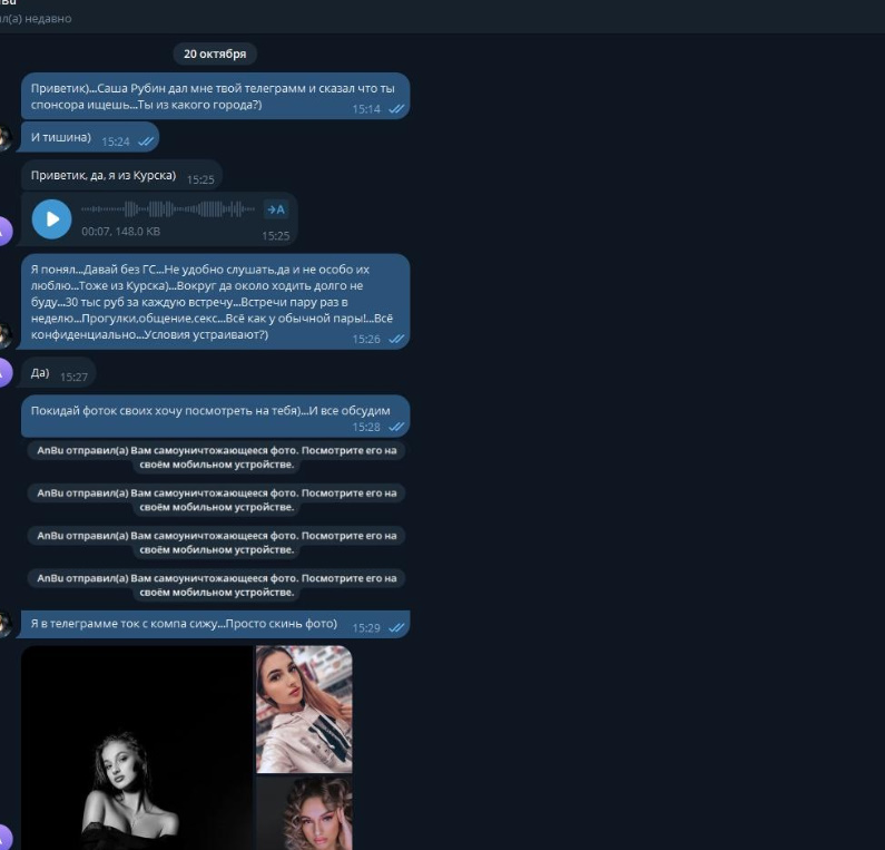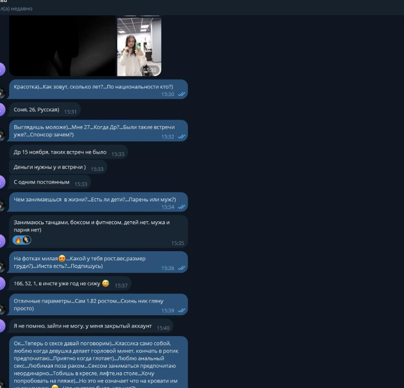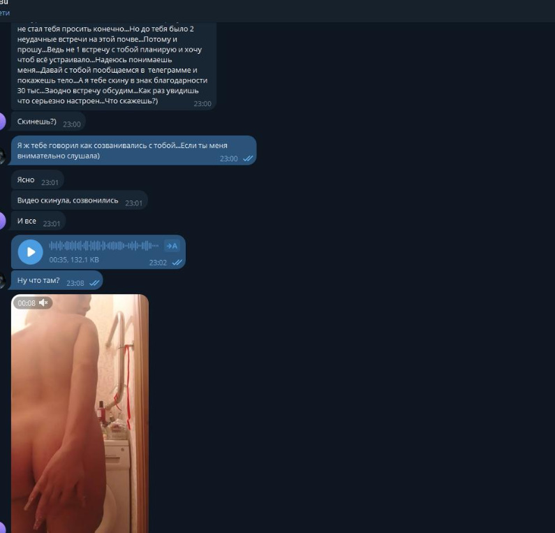 Была не против рассылки и публикации, хотя могла удалить за сумму, которую за неделю тратит, так как считает что деньги важнее всего, а реклама ее секс-услуг принесет ей доп.заработок.