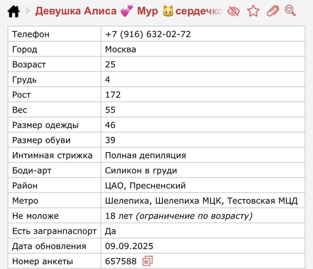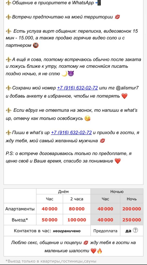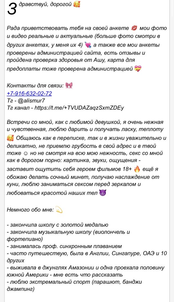 Она часто летает в Дубай, потому что там платят самые большие деньги. Клиенты устраивают встречи в формате мжм: один жестко трахает её в рот, пока другой ебет в задницу, а потом они меняются. После таких ночей её тело полностью вымотано, но гонорар перекрывает любую боль. Постепенно она подсела на меф — сначала чтобы расслабиться и выдержать многочасовые оргии, а теперь уже просто не может без дозы. В Дубае наркотики ей всегда приносят клиенты, и они любят, когда она ширяется прямо перед сексом. Теперь её жизнь крутится вокруг вылетов туда, доз и встреч, где она чувствует себя игрушкой, которую можно использовать как угодно.