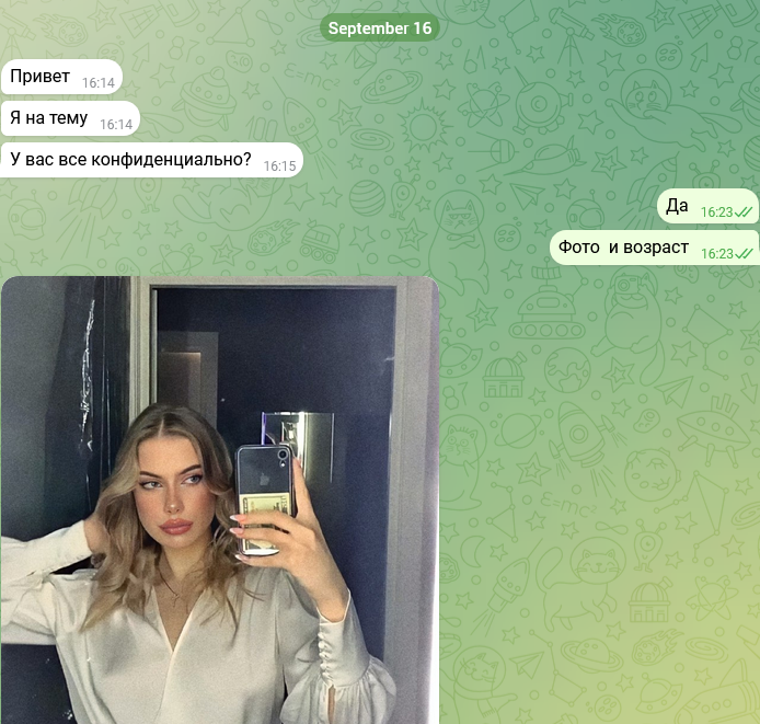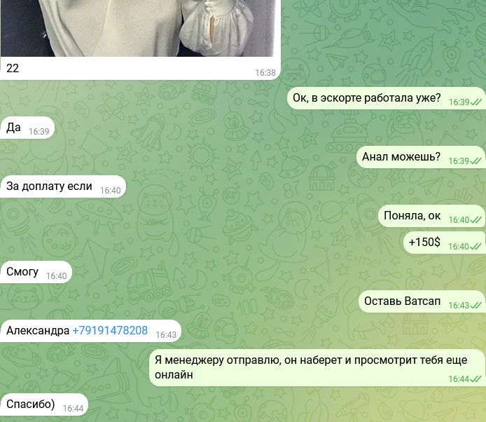 Была не против рассылки и публикации, так как считает что деньги важнее всего, а реклама ее секс-услуг принесет ей доп.заработок.