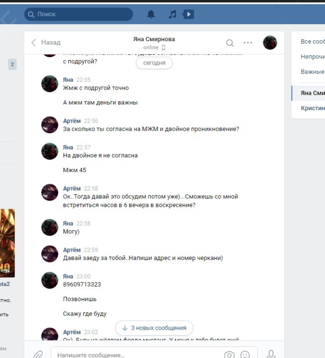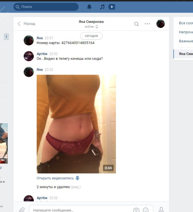 Была не против рассылки и публикации, хотя могла удалить за сумму, которую за неделю тратит, так как считает что деньги важнее всего, а реклама ее секс-услуг принесет ей доп.заработок.