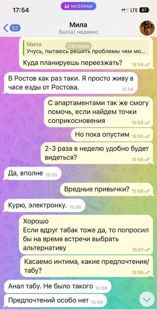 Была не против рассылки и публикации, хотя могла удалить за сумму, которую за неделю тратит, так как считает что деньги важнее всего, а реклама ее секс-услуг принесет ей доп.заработок.